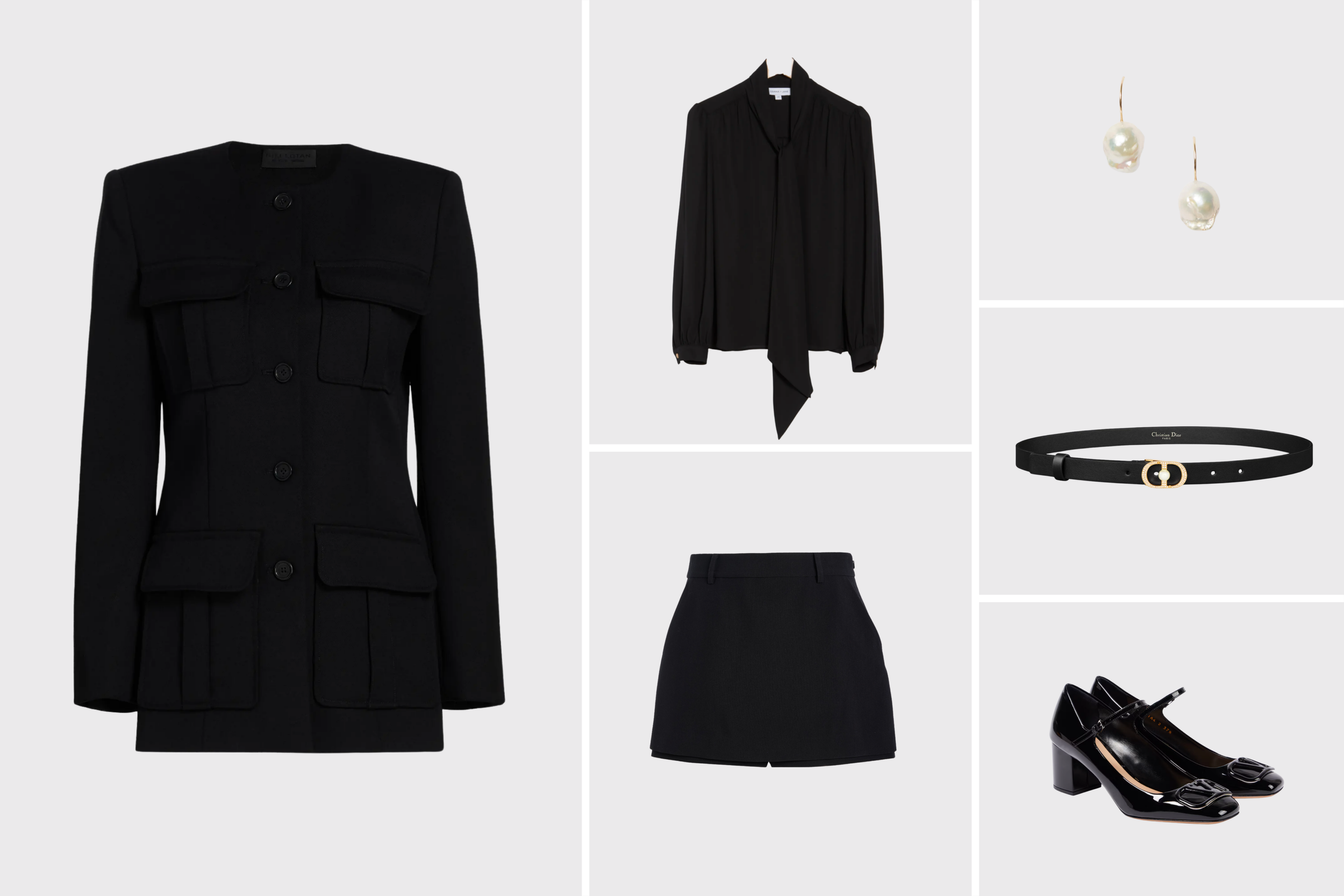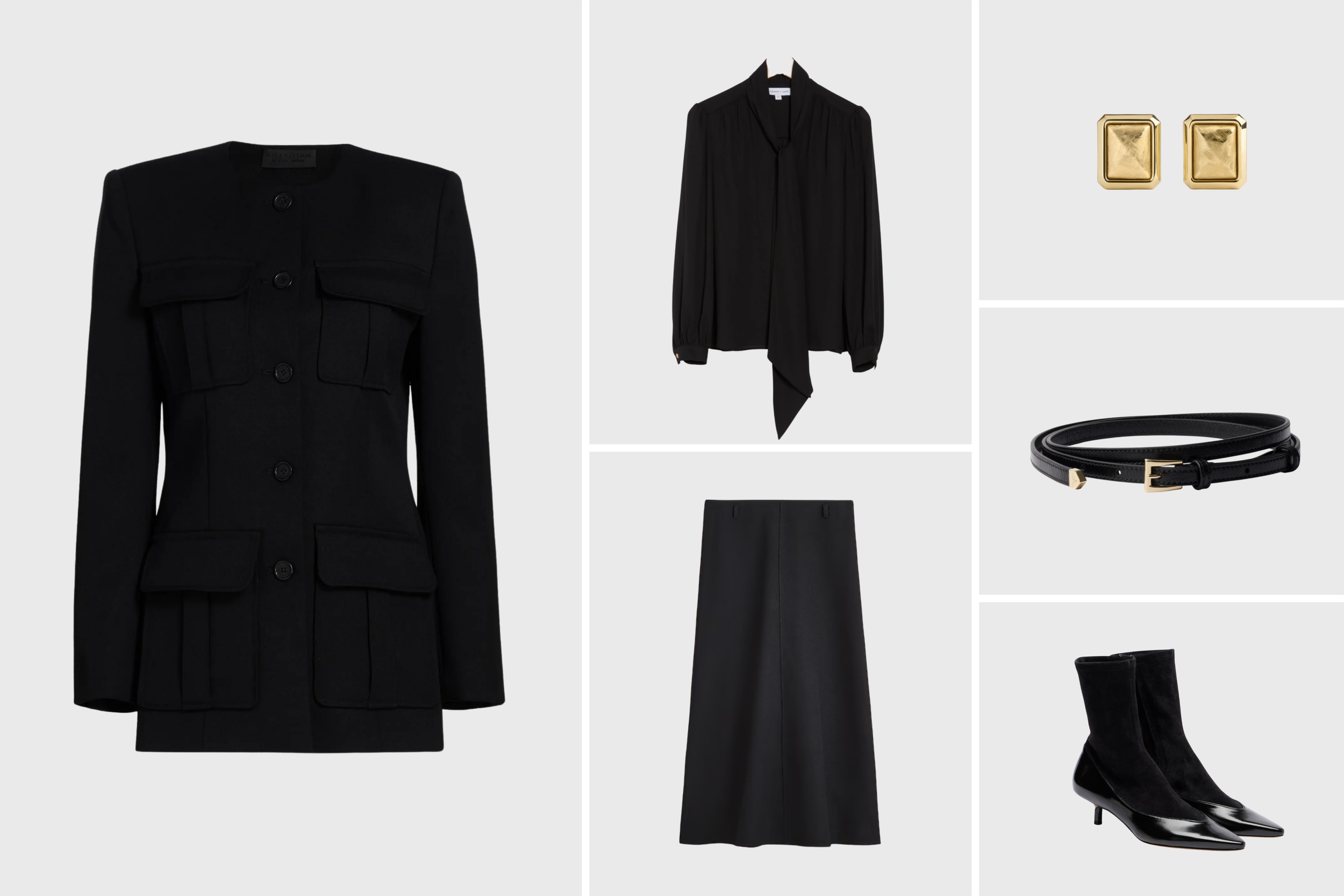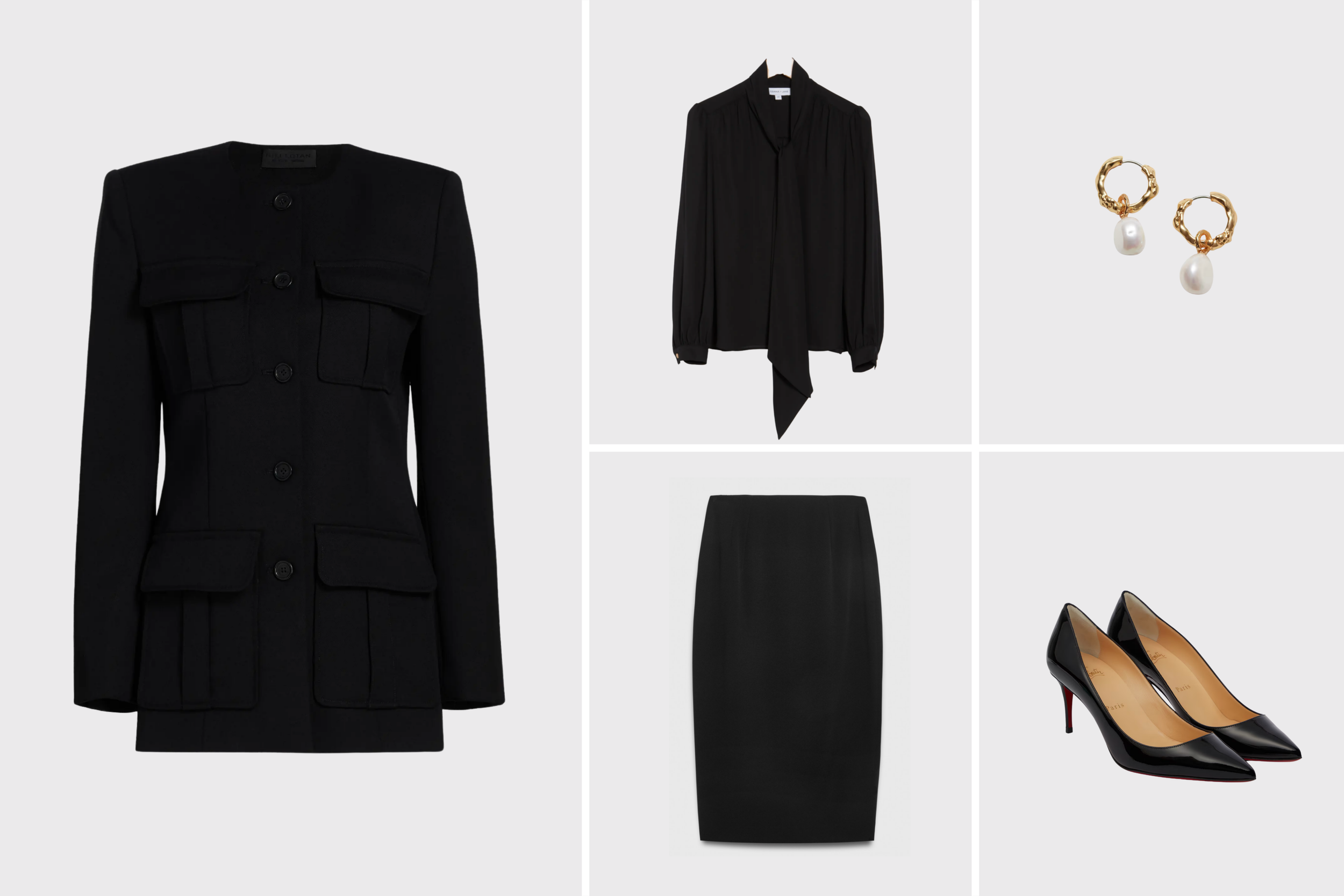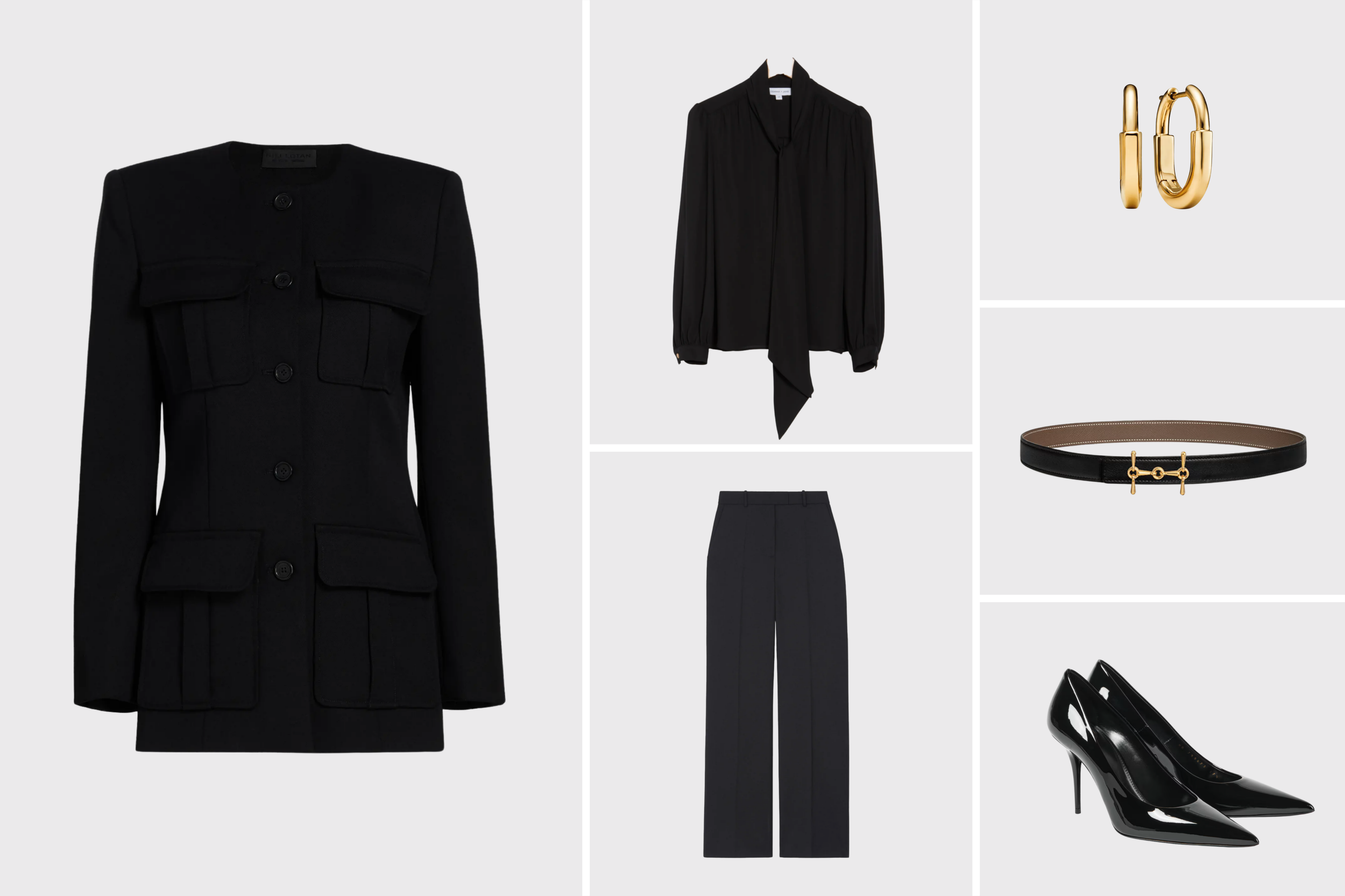 Each variation below preserves the essence of the original: polished restraint, subtle drama, and that quiet confidence that comes from precision. And let’s be honest — we love the simplicity of putting it together. Our work-appropriate interpretations (+ one easy OOO transition) each incorporate the blazer + bow pairing as the central code (top to bottom).