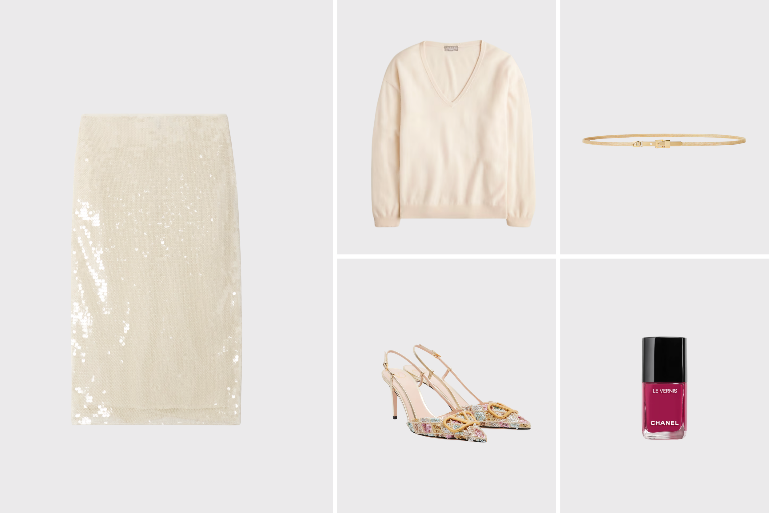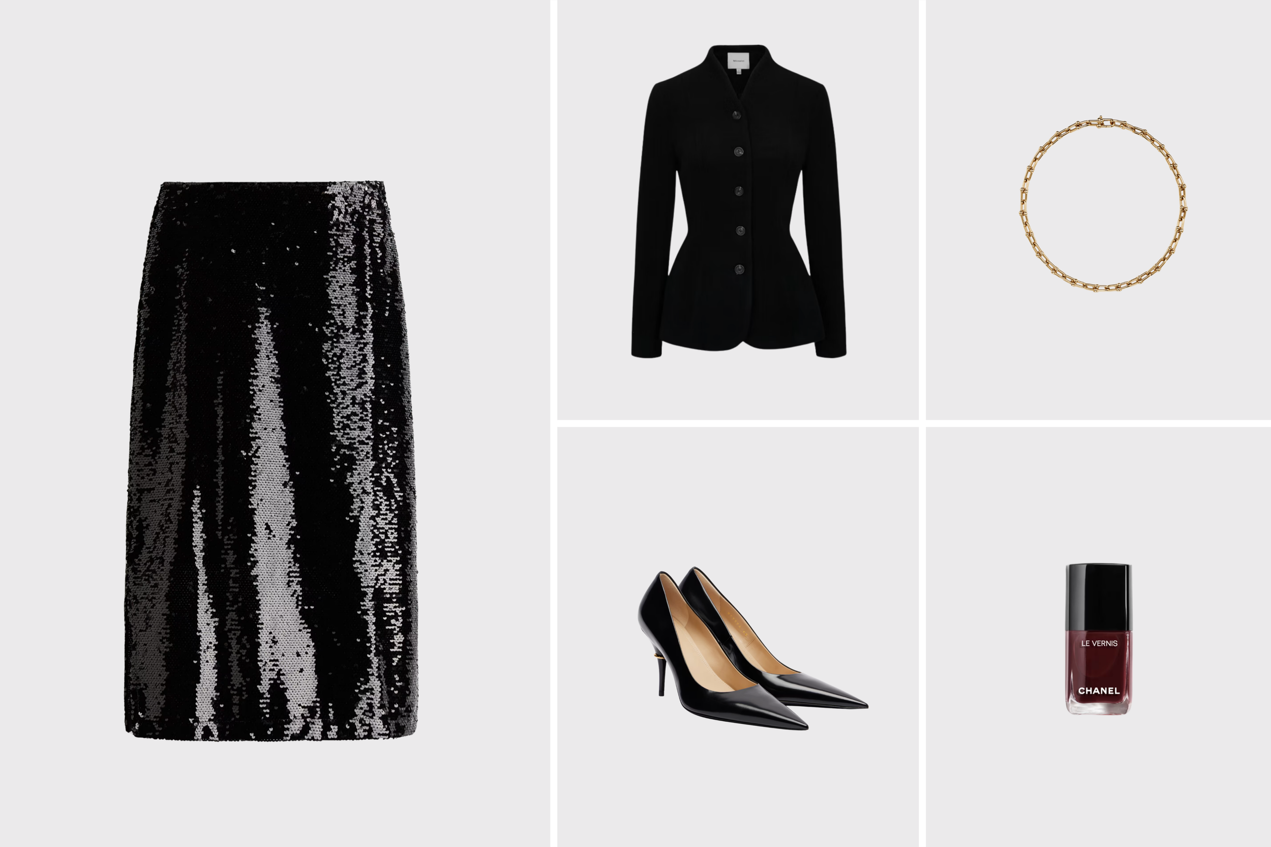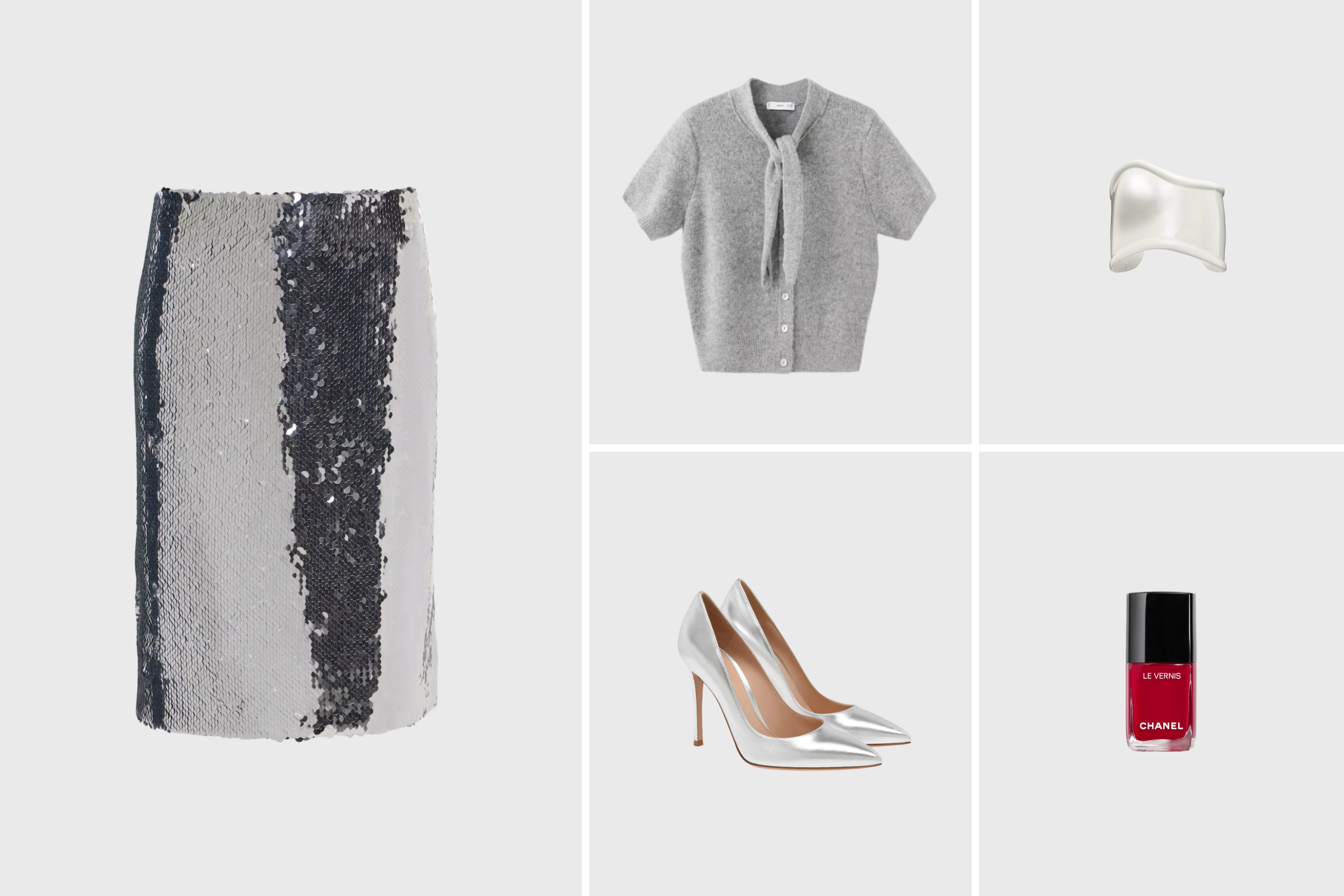 Sequin Skirt at the Christmas Party? Groundbreaking. But let’s be honest: we’re not here to reinvent the holiday wheel, we’re here to sharpen it. And the Runway to Office report left no room for debate: sequins remain the most reliable way to “festivize” (yes, we’re coining that word) the corporate end-of-year ecosystem. FW25 (from left above: Elie Saab, Elisabetta Franchi, and then Fendi first from right) and beyond (second from right: Chanel PF2026) recast them not as disco relics but as a polished, intentional surface — one that can hold its own under fluorescent lighting and a Q4 budget reviews. From oxblood paillettes to glacial metallics, the runways treated sequins with discipline, softness, and grown-up sophistication. Translation: still sparkly, but with a point of view. They’re officially sanctioned for work-adjacent festivities, provided you resist the gravitational pull toward chaos. Because — and here’s the plot twist — there is a very limited number of ways that a sequin skirt reads truly elevated and not like a mall-grade tinsel garland. These flatlays pick up exactly where the report left off: translating the season’s high-shine mood into office-appropriate festive looks. Each outfit keeps the sparkle controlled and intentional, pairing sequin pencil skirts with sharp tailoring, tonal knits, and quietly luxurious accessories — proving that holiday dressing can be both editorial, modern and entirely boardroom-ready.
