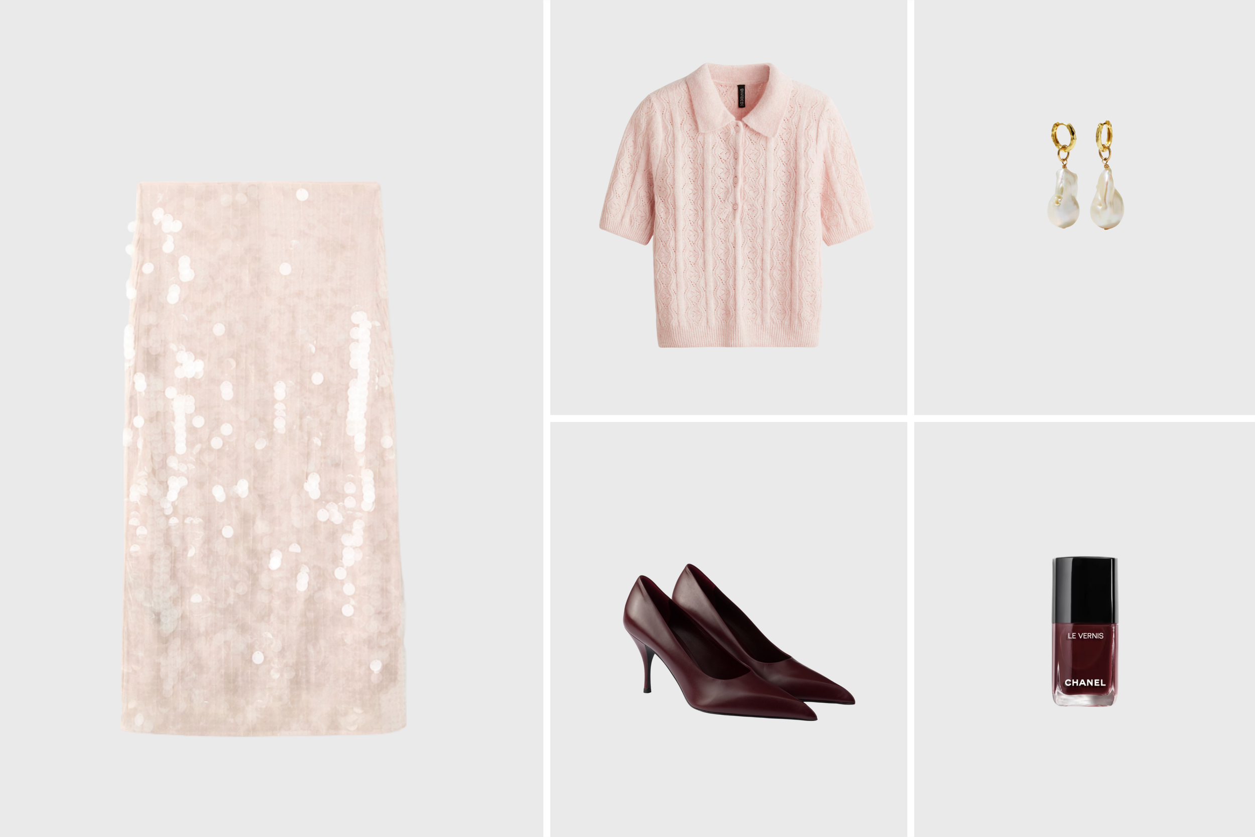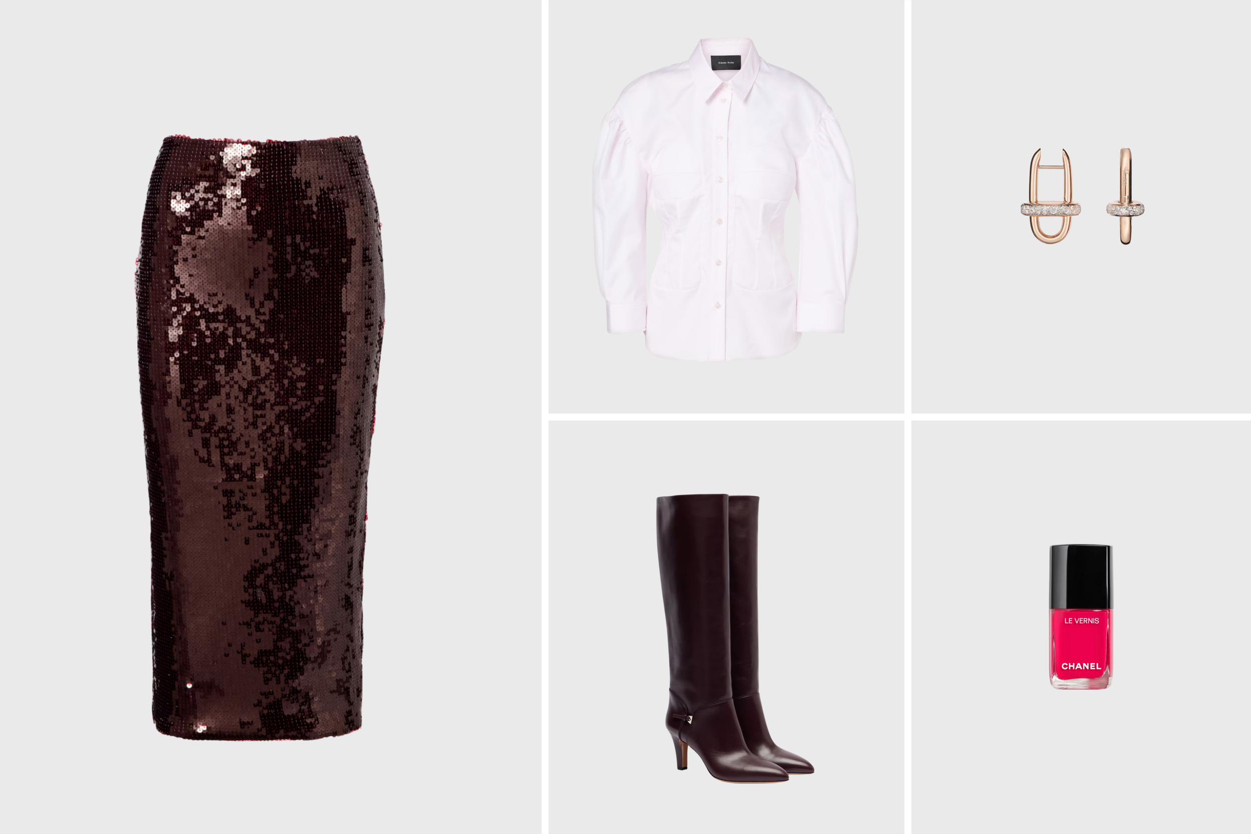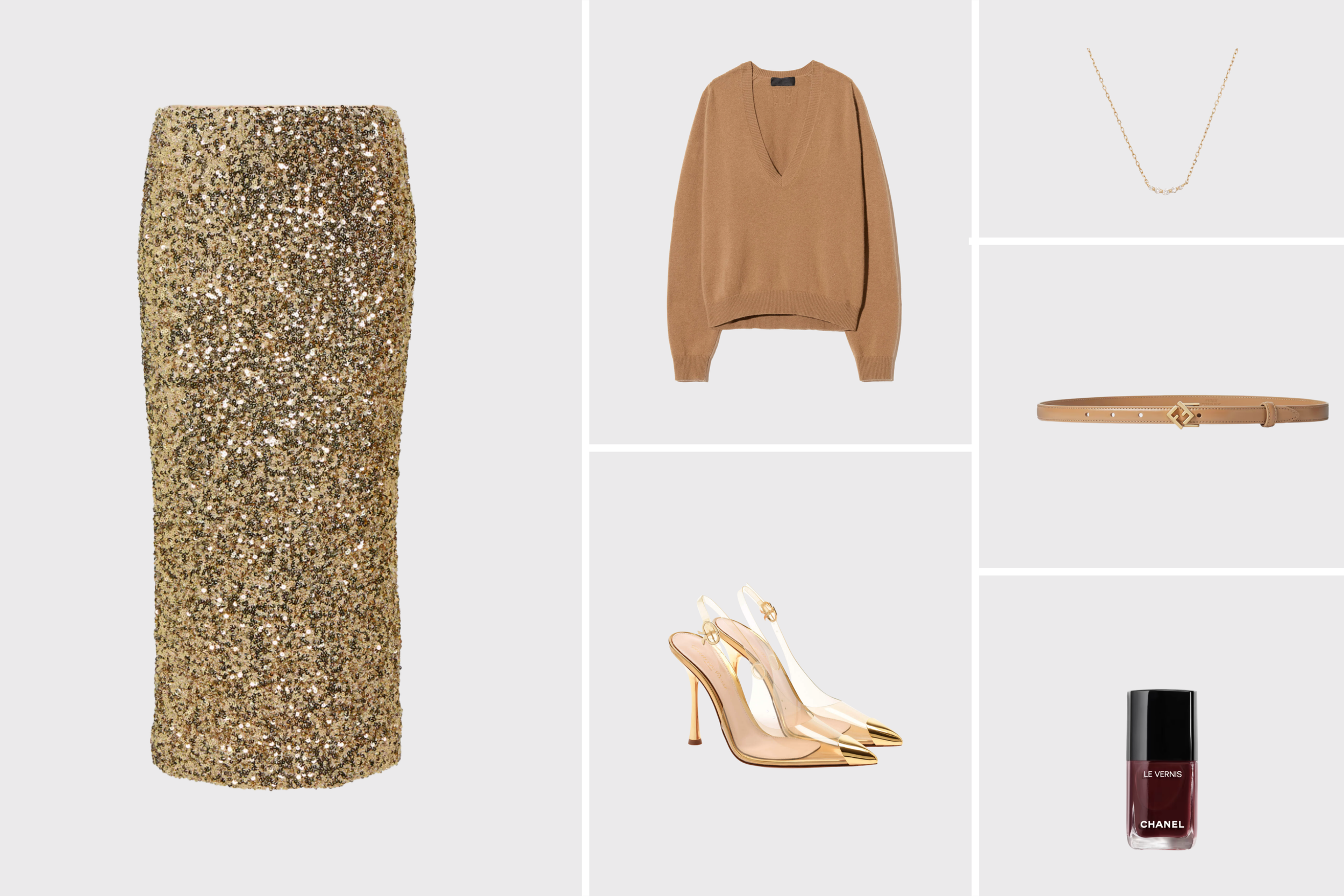 Sequin Skirt at the Christmas Party? Groundbreaking. But let’s be honest: we’re not here to reinvent the holiday wheel, we’re here to sharpen it. And the Runway to Office report left no room for debate: sequins remain the most reliable way to “festivize” (yes, we’re coining that word) the corporate end-of-year ecosystem. FW25 (from left above: Elie Saab, Elisabetta Franchi, and then Fendi first from right) and beyond (second from right: Chanel PF2026) recast them not as disco relics but as a polished, intentional surface — one that can hold its own under fluorescent lighting and a Q4 budget reviews. From oxblood paillettes to glacial metallics, the runways treated sequins with discipline, softness, and grown-up sophistication. Translation: still sparkly, but with a point of view. They’re officially sanctioned for work-adjacent festivities, provided you resist the gravitational pull toward chaos. Because — and here’s the plot twist — there is a very limited number of ways that a sequin skirt reads truly elevated and not like a mall-grade tinsel garland. These flatlays pick up exactly where the report left off: translating the season’s high-shine mood into office-appropriate festive looks. Each outfit keeps the sparkle controlled and intentional, pairing sequin pencil skirts with sharp tailoring, tonal knits, and quietly luxurious accessories — proving that holiday dressing can be both editorial, modern and entirely boardroom-ready.