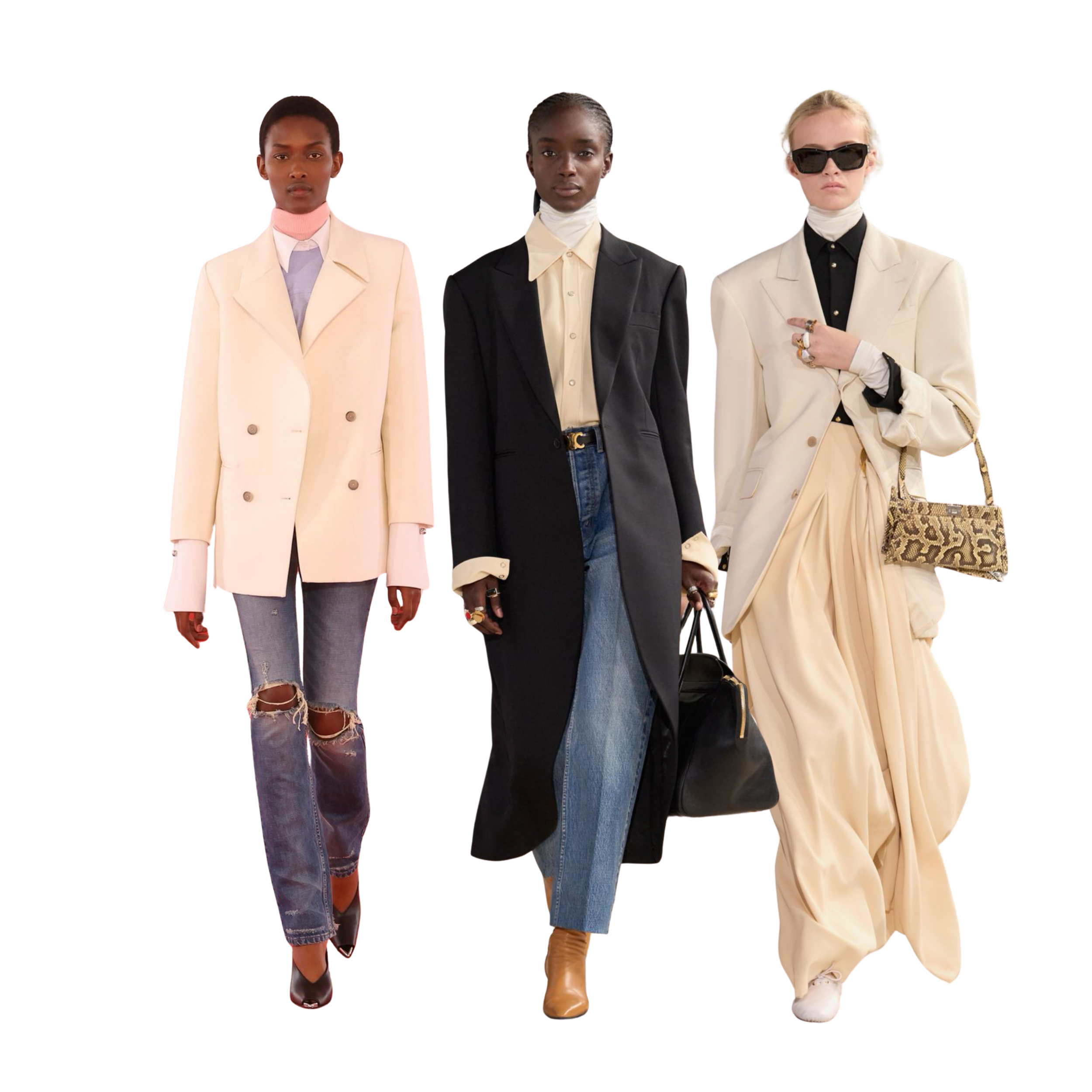 This is where the look either sharpens or falls apart. A clean, structured shoulder pulls everything back into alignment and prevents the layered neckline from reading experimental. Without that structure, the upper half becomes visually busy and loses authority.