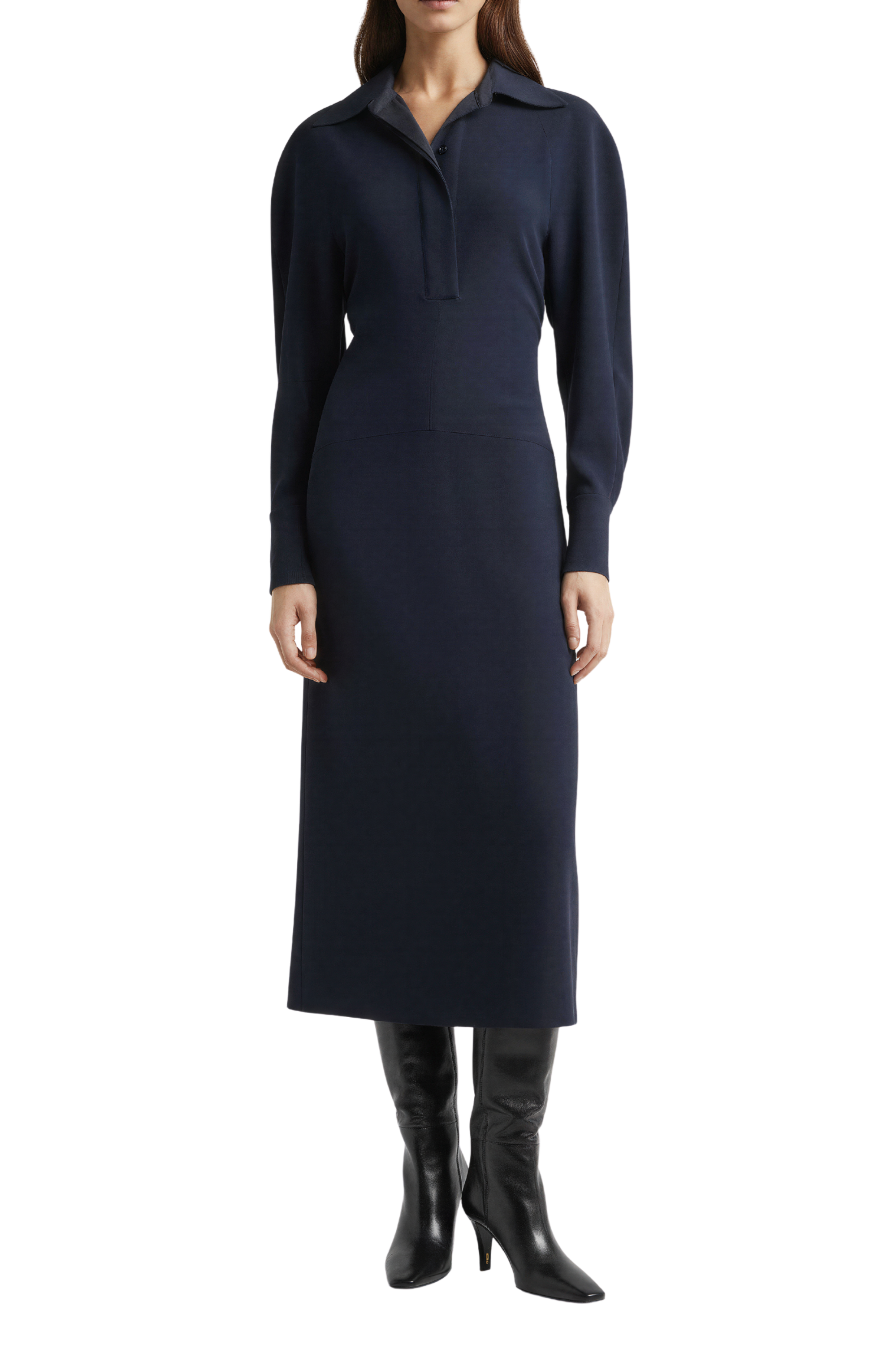 A navy column dress establishes a clean vertical base. Structured black boots add architectural weight at the foundation, reinforcing the line instead of breaking it. The silhouette remains uninterrupted, but gains presence. We love this dress for the gathered detail at the back.