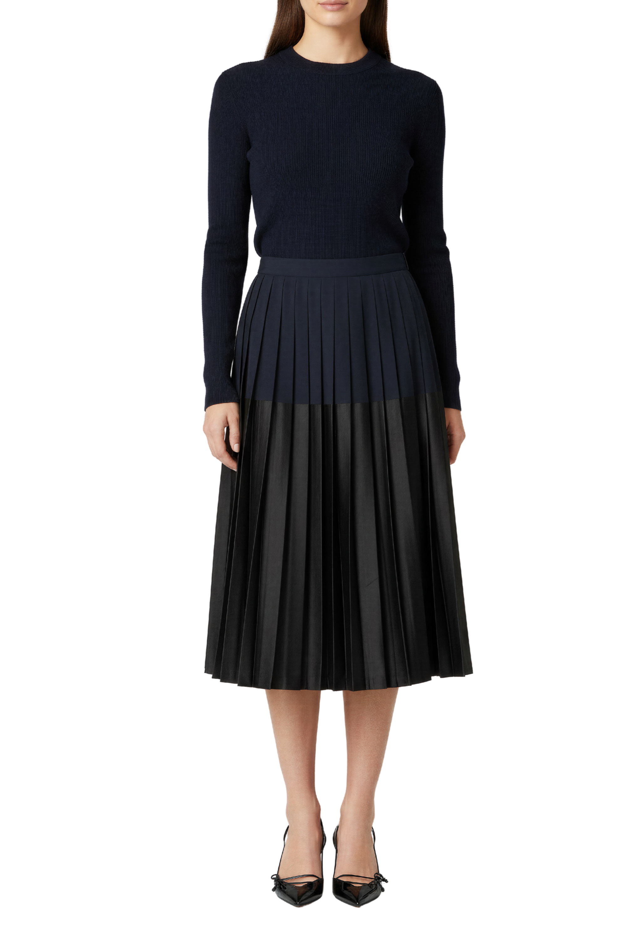 Matte navy against black leather creates depth without heaviness. The pencil silhouette elongates the line, and a sharp black pump maintains continuity from waist to floor.