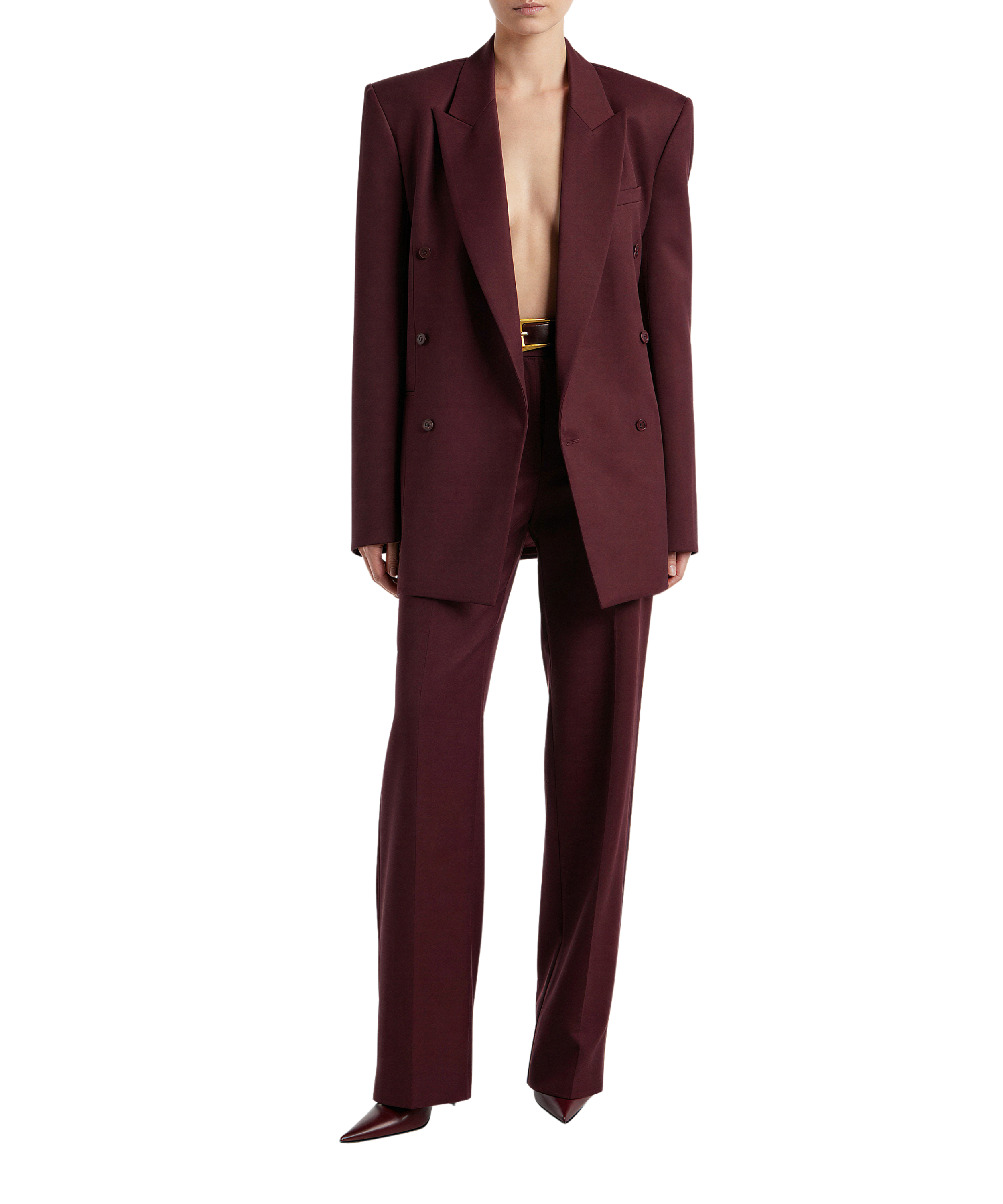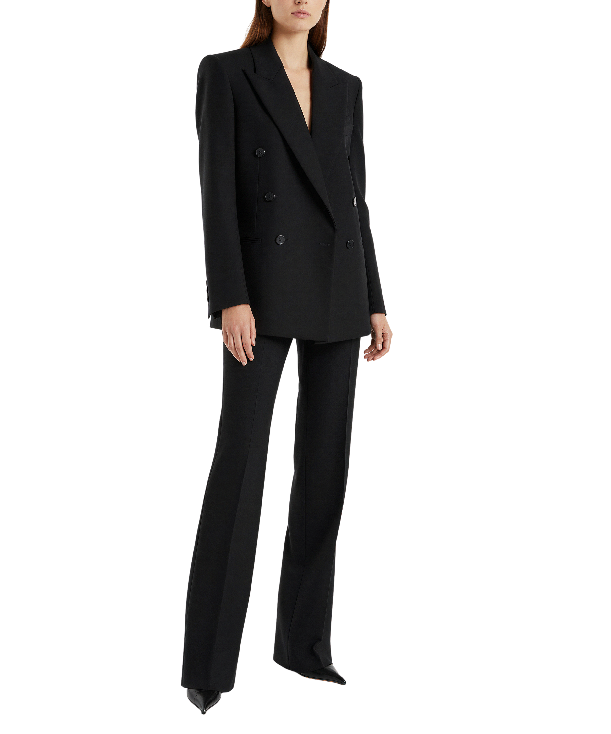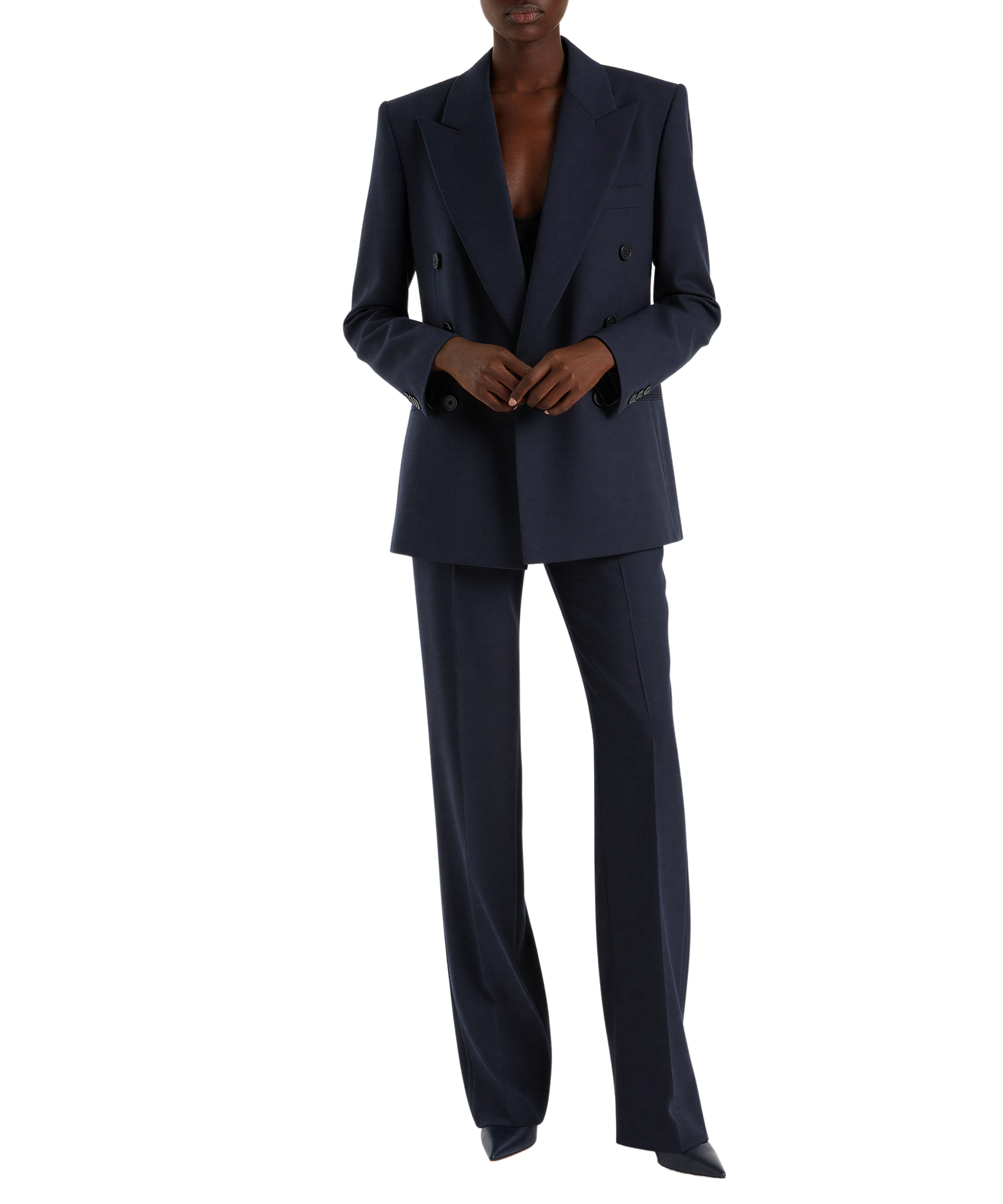 Double-breasted. Slightly masculine. Shoulder presence. Cut with ease — or closer to the body if preferred. The authority sits here.