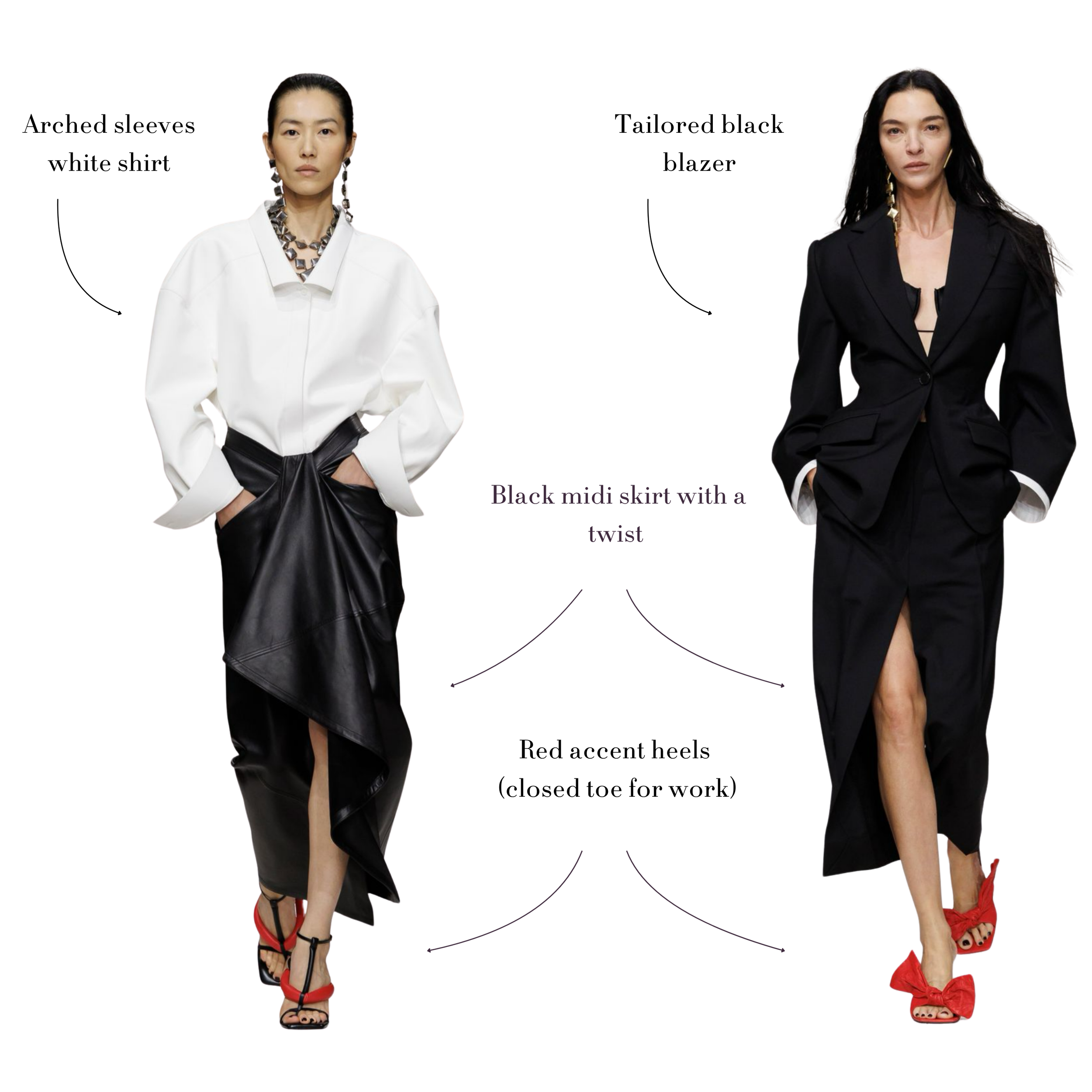 March 11, 2026. Givenchy’s SS2026 collection offers a surprisingly practical template for professional dressing. Many runway looks rely on pieces already familiar in a work wardrobe — tailoring, white shirts, midi skirts — but the collection bring subtle modern updates to those pieces and how they are combined. The result is a look that feels sharp and current without depending on unusual garments or complex styling. For readers trying to translate runway signals into real outfits, this makes the formula particularly usable: the building blocks are standard, and the update comes from proportion, skirt construction, and the disciplined use of a single accent color. In other words, the collection provides a clear, repeatable structure that can be applied directly to executive wardrobes with minimal adjustment.