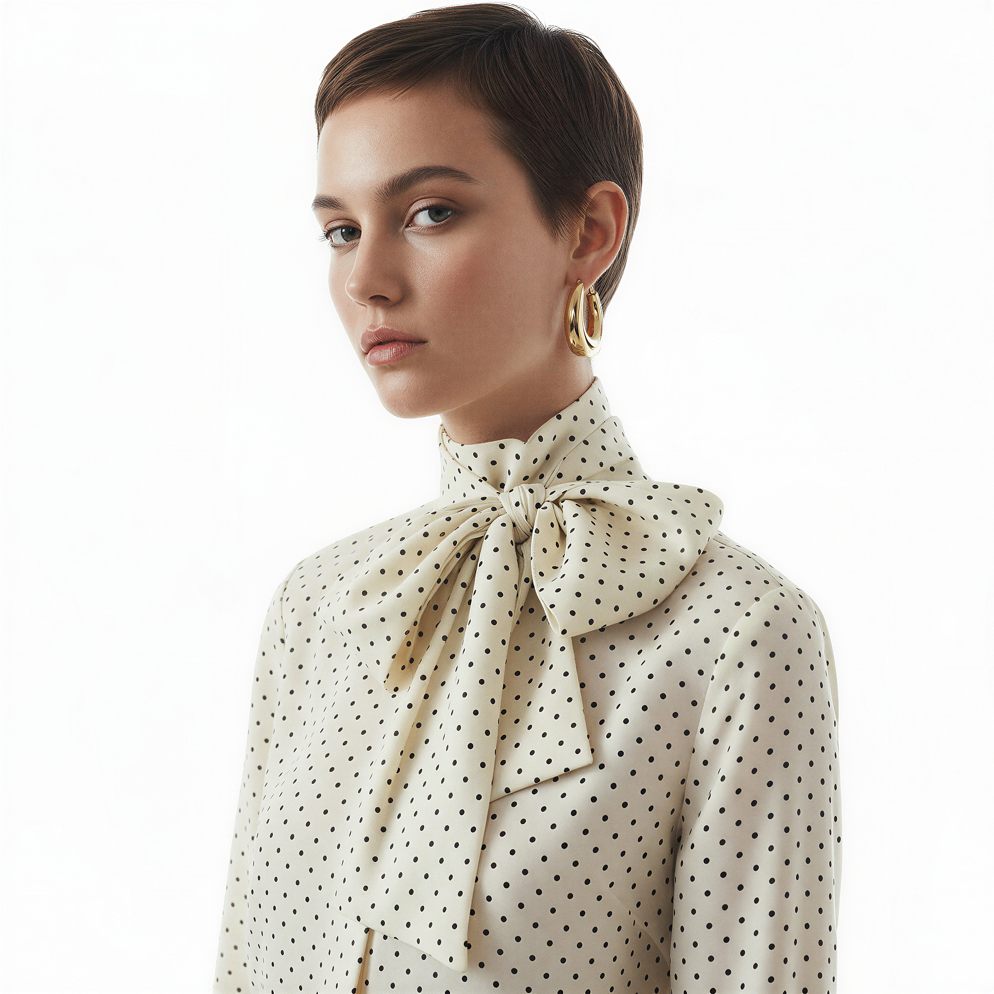 No necklace. The blouse already occupies that space. Keep the gold controlled — small hoops, domed, or sculptural shapes — to soften the black-and-white without adding noise.