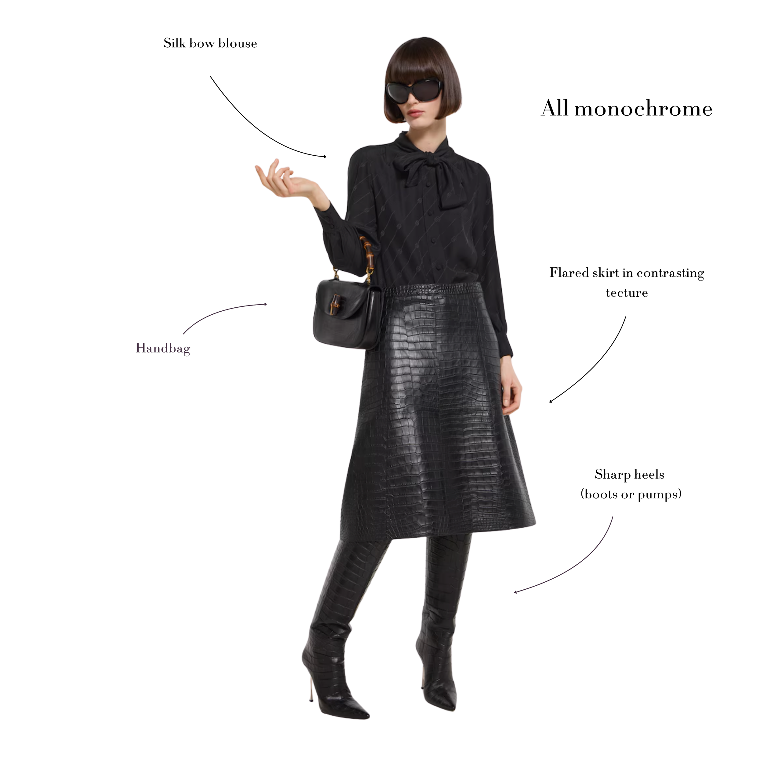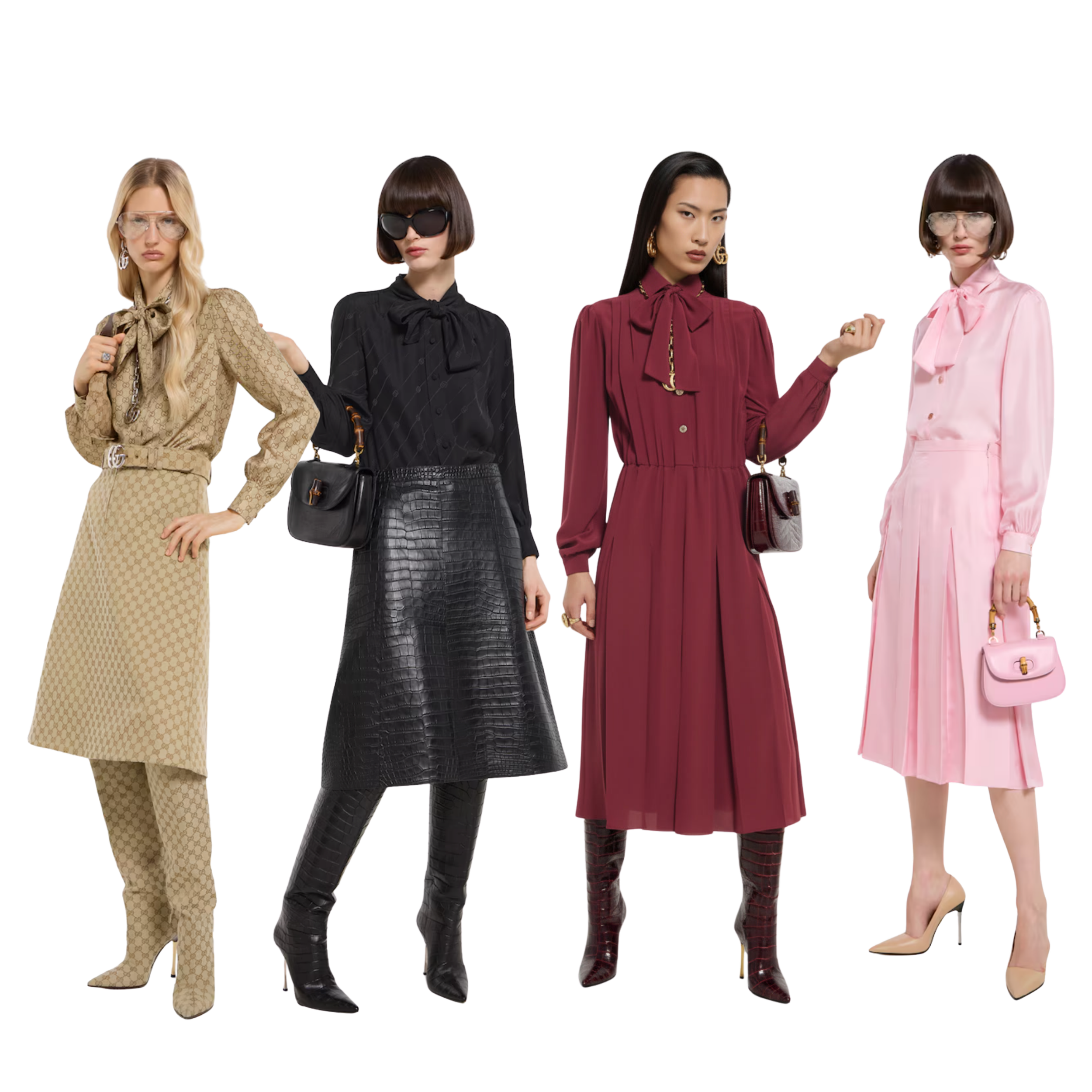 March 9, 2026. At first glance, Gucci’s SS26 signature look (all above) feels almost dated: a silk bow blouse, an A-line skirt, and sharp heels—classic bourgeois wardrobe territory. But what makes it instantly modern is the way Demna sharpens the formula: silhouettes are cleaner, monochrome dominates, and contrasting textures—fluid silk against stiff leather or crisp wool—add tension. The nostalgia is stripped of decoration and pushed into graphic clarity, turning a familiar ladylike uniform into something far more modern and authoritative. What’s not to like for moments when projecting composure, discipline, and authority matters.