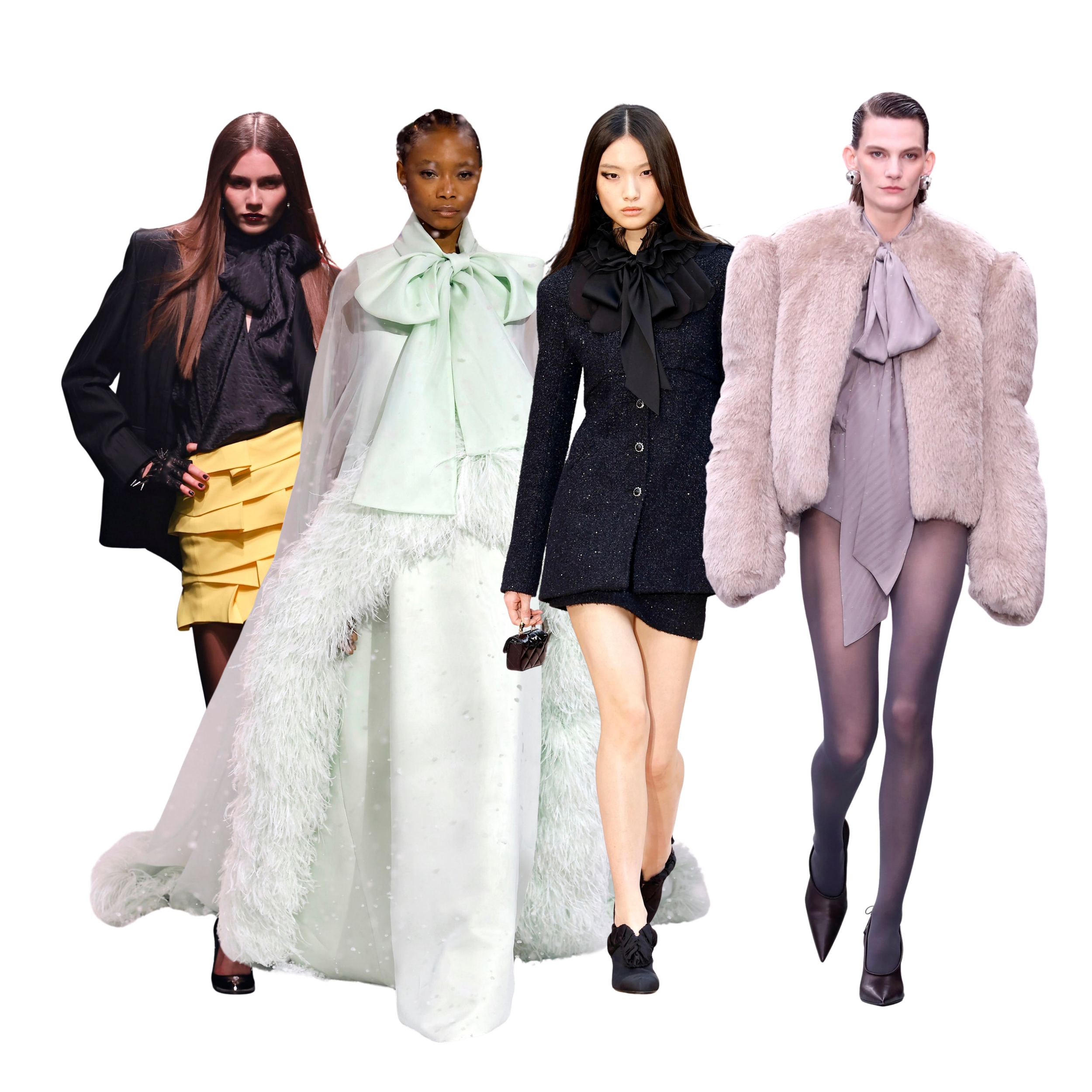 ✔ Mind the proportions: Medium to large bows feel current, but the rest of the outfit should stay lean — narrow sleeves, streamlined torso.
