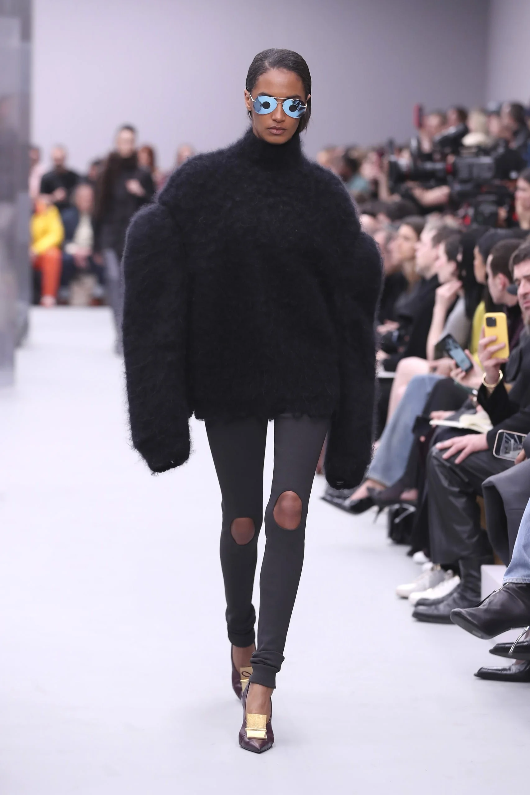 FW25 has fully embraced the idea of “soft volume” — those oversized, airy, cloud-like tops that borrow equally from knitwear, fur textures, and feather-light fringe. Designers (Acne Studios FW 2025 above, ©NowFashion) are exaggerating proportions, pushing shoulders outward and sleeves longer, using fluff as architecture. These pieces create presence without hardness: maximal scale, minimal effort. Whether in brushed mohair, shaggy wool blends, faux-fur, or technical fringes, the silhouette is the same — a cocoon that feels both avant-garde and deeply comforting. Crucially: this trend isn’t about bulk; it’s about air. The best versions look weightless, almost floating around the frame.