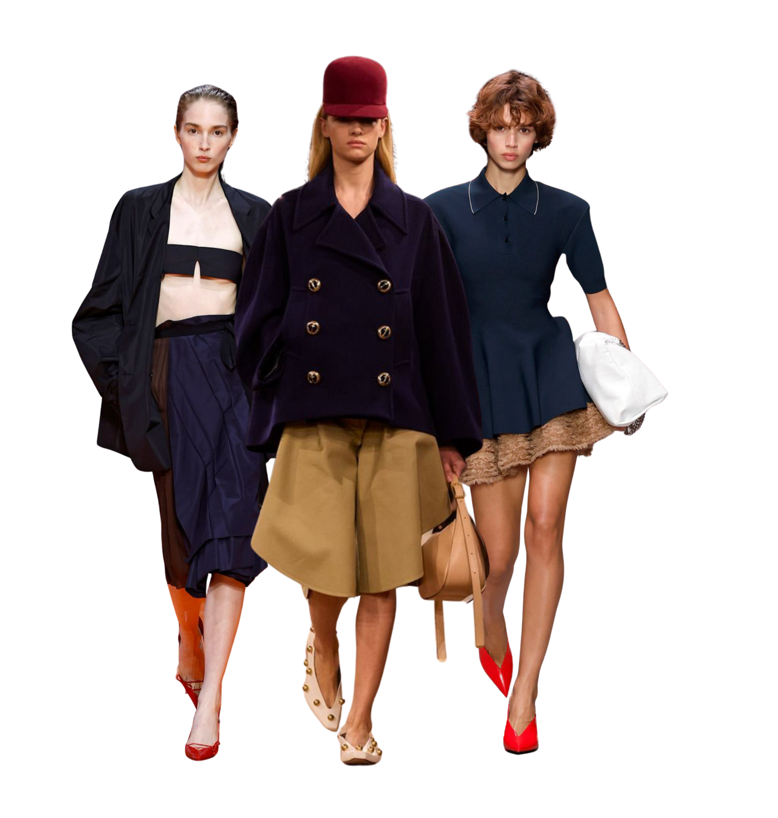 A third formula appears more sparingly but with impact: navy as the base, a soft neutral layered in, and a precise red accent — often in the form of a shoe (above from SS2026 runways: Prada, Balenciaga, Stella McCartney). The red is never loud and the restraint of navy makes the red feel deliberate rather than decorative. For work, this is a way to introduce energy without abandoning structure. What to look for: a strong navy base piece (dress or blazer) + a camel, sand, or pale grey piece (here we choose a cotton skirt) + a small red accent: a sharp heel, structured bag, or belt.