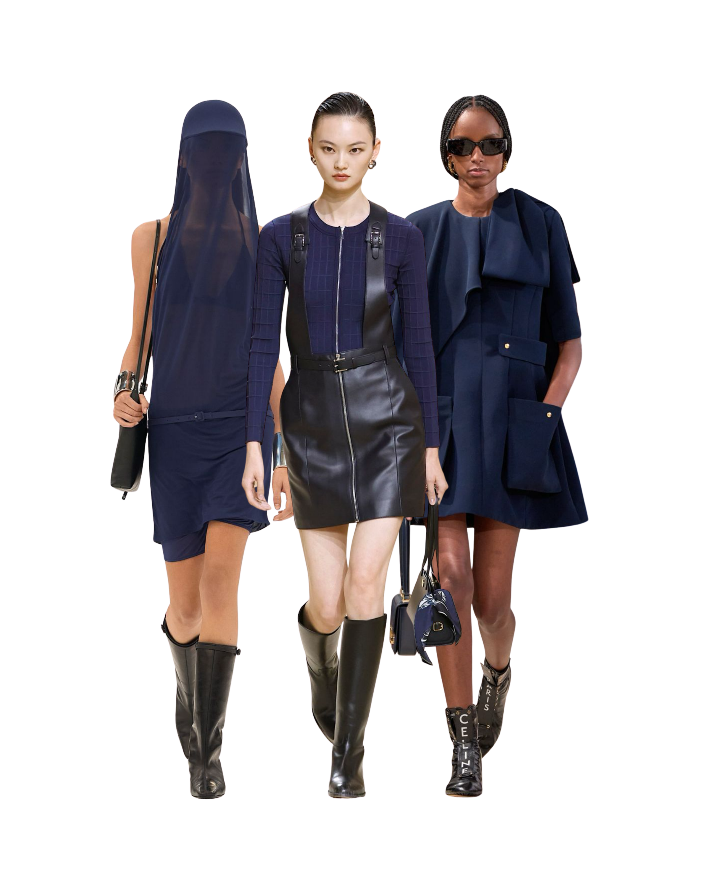 Head-to-toe navy appears very frequently, anchored with black leather garments and accessories — especially shoes (above from SS26 runways: Courrèges, Hermès and Celine). The black is not a mistake. It sharpens navy. It gives it edge. Once considered a faux pas, navy and black has time and time again proven to be the formula to play dark neutrals with a personality. Navy against glossy or structured black leather creates surface contrast without breaking the vertical line and, for work, this combination gives an easy way to read modern and disciplined.