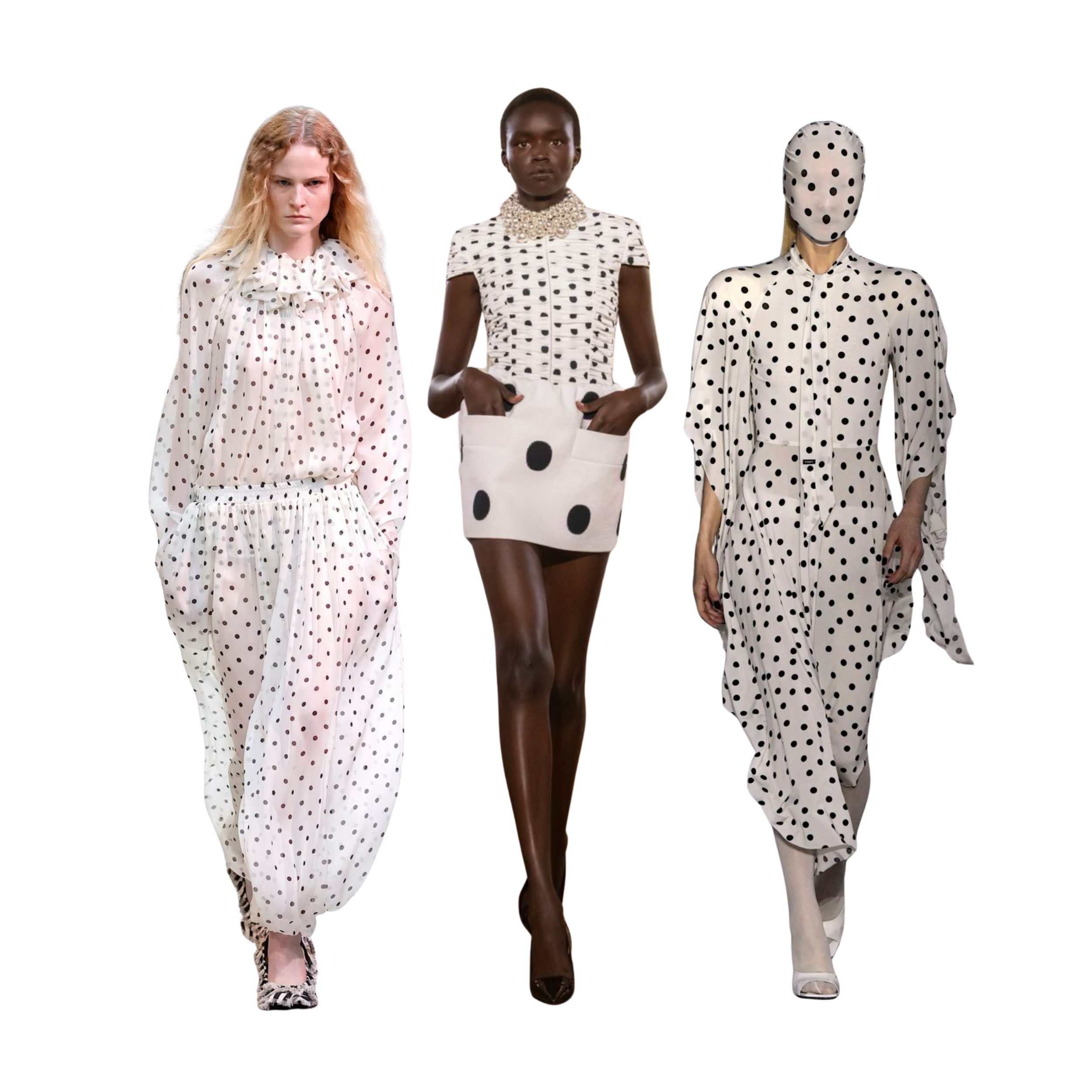 March 16, 2026. Polka dots are back again this season (above from SS2026 runways: MSGM, Patou and Vetements), but in a materially different register. A few months ago, the dominant version came on a dark ground — structured, graphic, almost severe. Now the base turns light: ivory, cream, sometimes optic white, with black dots scattered across it. The effect is immediately softer. Less anchored. Slightly more decorative. A small visual shift — but one that changes how the piece performs.