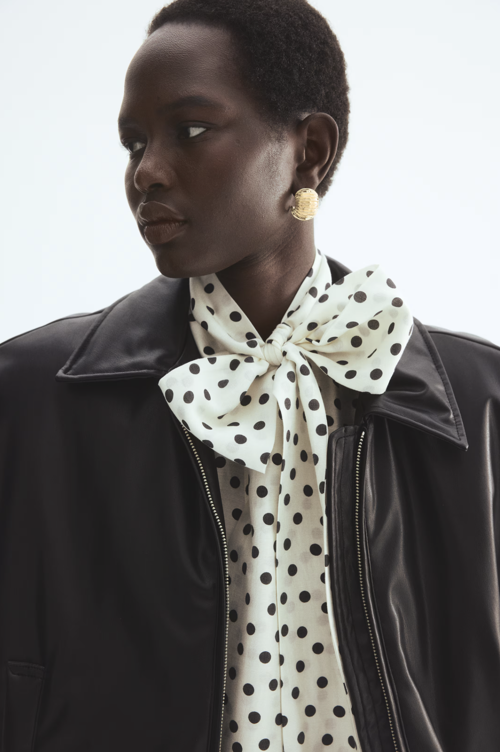 What makes this version interesting for professional settings is precisely what makes it risky. The light ground introduces movement and approachability — something many work wardrobes lack. It softens without collapsing into casual. But the black dots retain a graphic discipline. They keep the blouse from dissolving into something purely feminine or ornamental. Done right, the piece conveys a presence that avoids both severity and softness — you don’t read as overly formal, but you also don’t fade into something merely agreeable. That’s where it earns its place (below from H&M).