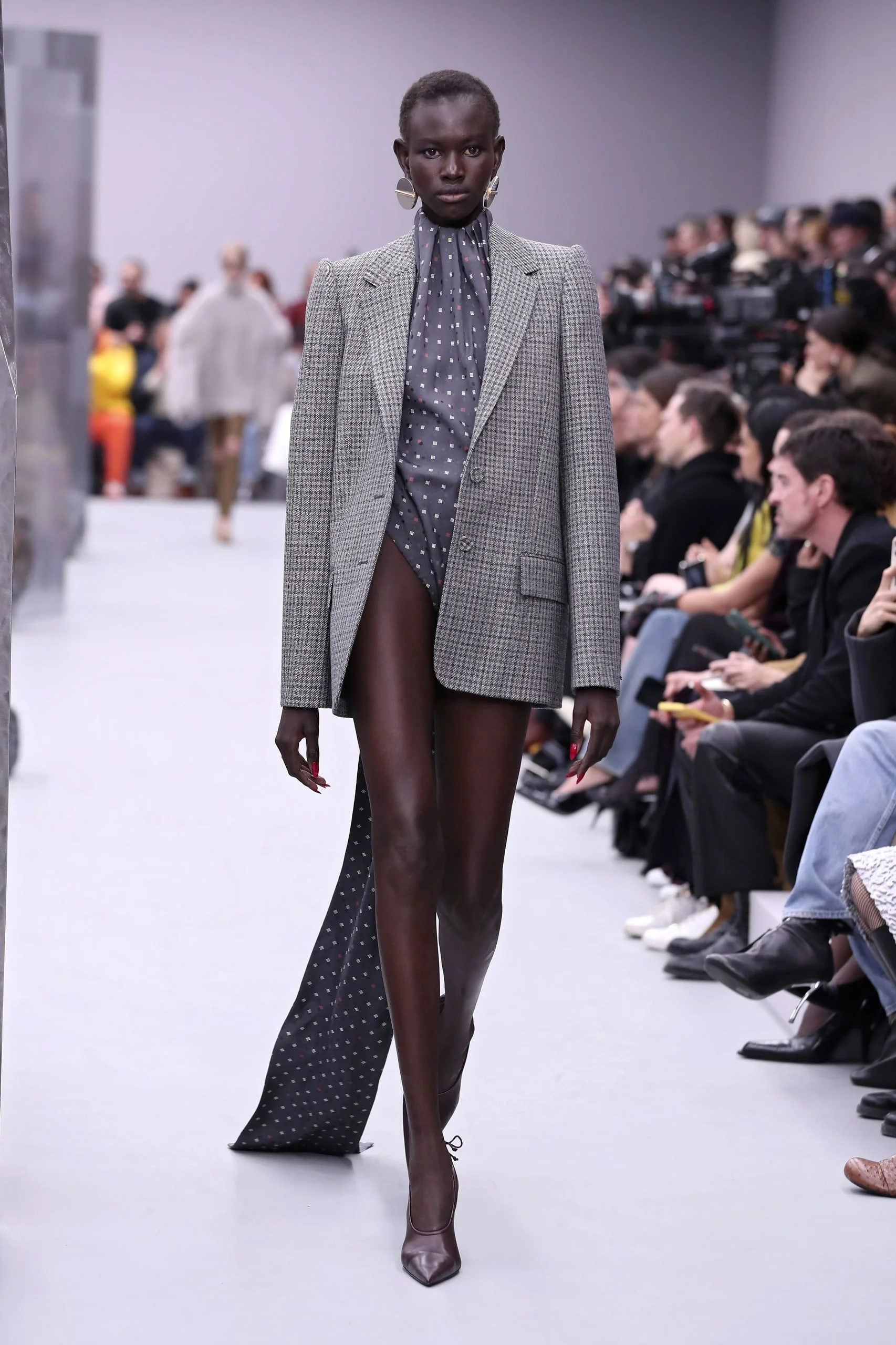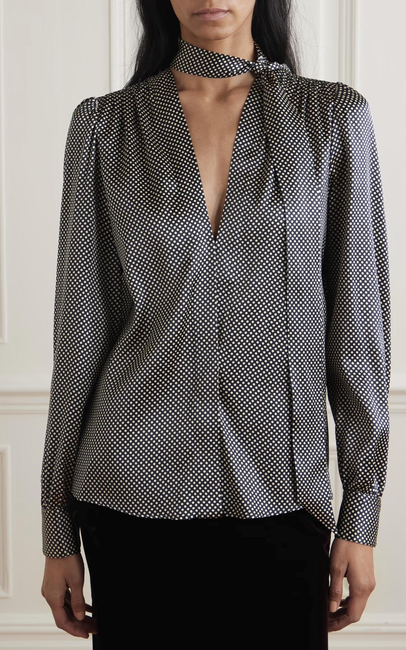October 10, 2025. Micro polka dots, rendered on dark, fluid blouses, move the motif out of nostalgia and into a more controlled, almost technical register. The reduced scale and soft fabric prevent the pattern from asserting itself, allowing it to sit comfortably within the discipline of tailoring. It holds in corporate settings because it reads as texture rather than print, especially when framed by sharp suiting and restrained silhouettes. The interest comes from the contrast: strict, often masculine structure against a surface that is subtly animated and slightly elusive. What once felt decorative becomes a precise way to introduce movement without breaking the line. Case in point above from Fall Winter 2025 Acne Studios runway © FashionNow; below from Tom Ford.