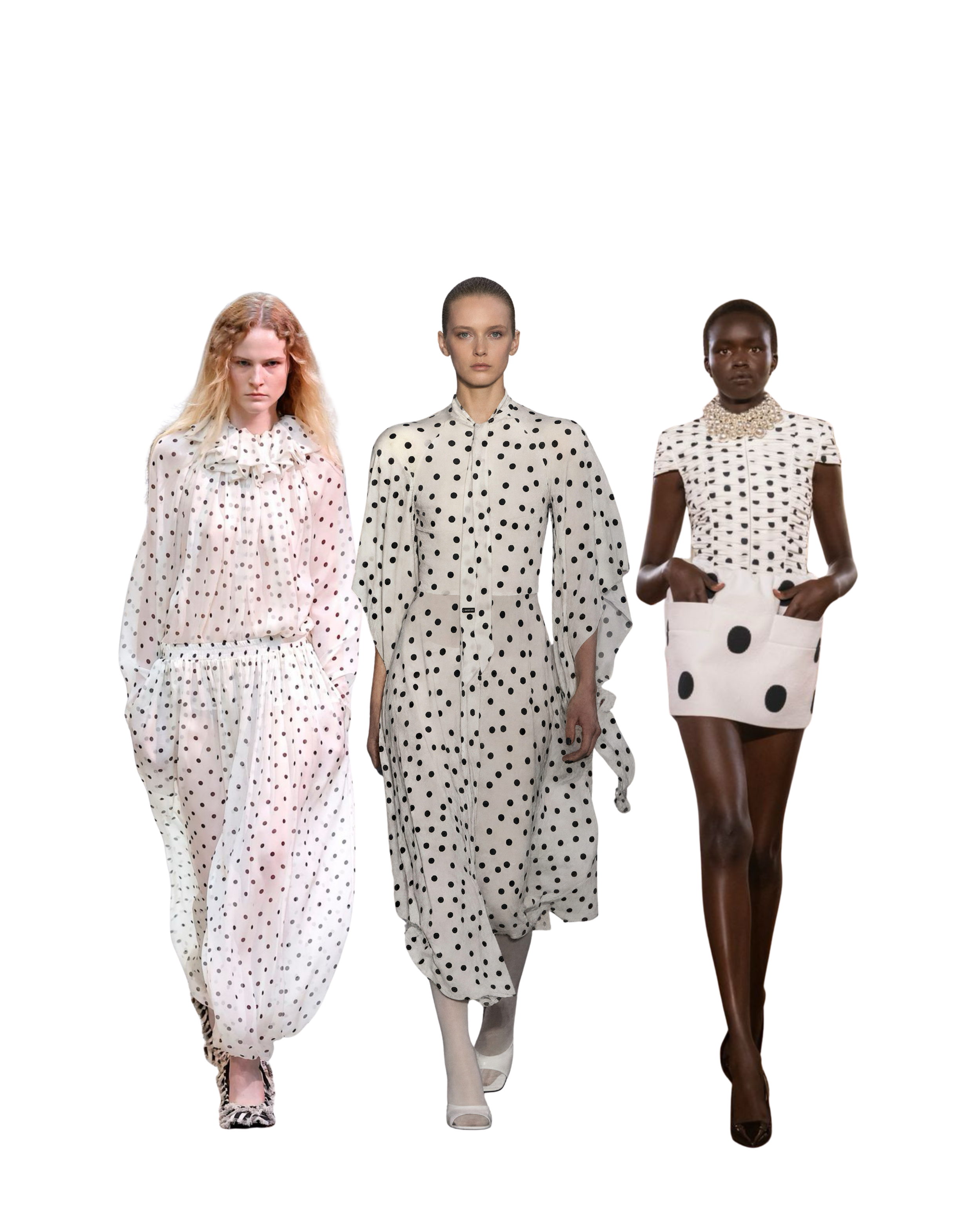 March 16, 2026. Polka dots are back again this season and have moved onto light grounds—ivory, cream, optic white—shifting the print from sharp and graphic to something visibly softer. The blouse is where this change becomes usable: the surface carries lightness and movement, but the garment itself remains stripped back. No added detail, no ornament, no excess construction—just a clean, controlled shape holding the print in place. That absence of decorative detail is what makes it work in a corporate setting, keeping the piece anchored despite its softer register. The tension comes from that contrast: a visibly lighter, more decorative surface contained within a silhouette that refuses decoration. That’s where it earns its place (below from H&M). Case in point above from Spring Summer 2026 runways: MSGM, Vetements and Patou.